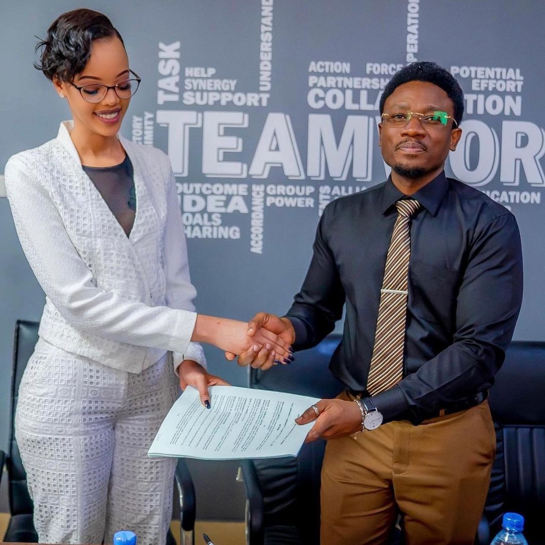 Umuyobozi Nshingwabikorwa wa Wasafi ari kumwe na Mutesi Jolly nyuma yo gushyira umukono ku masezerano y'imikoranire
