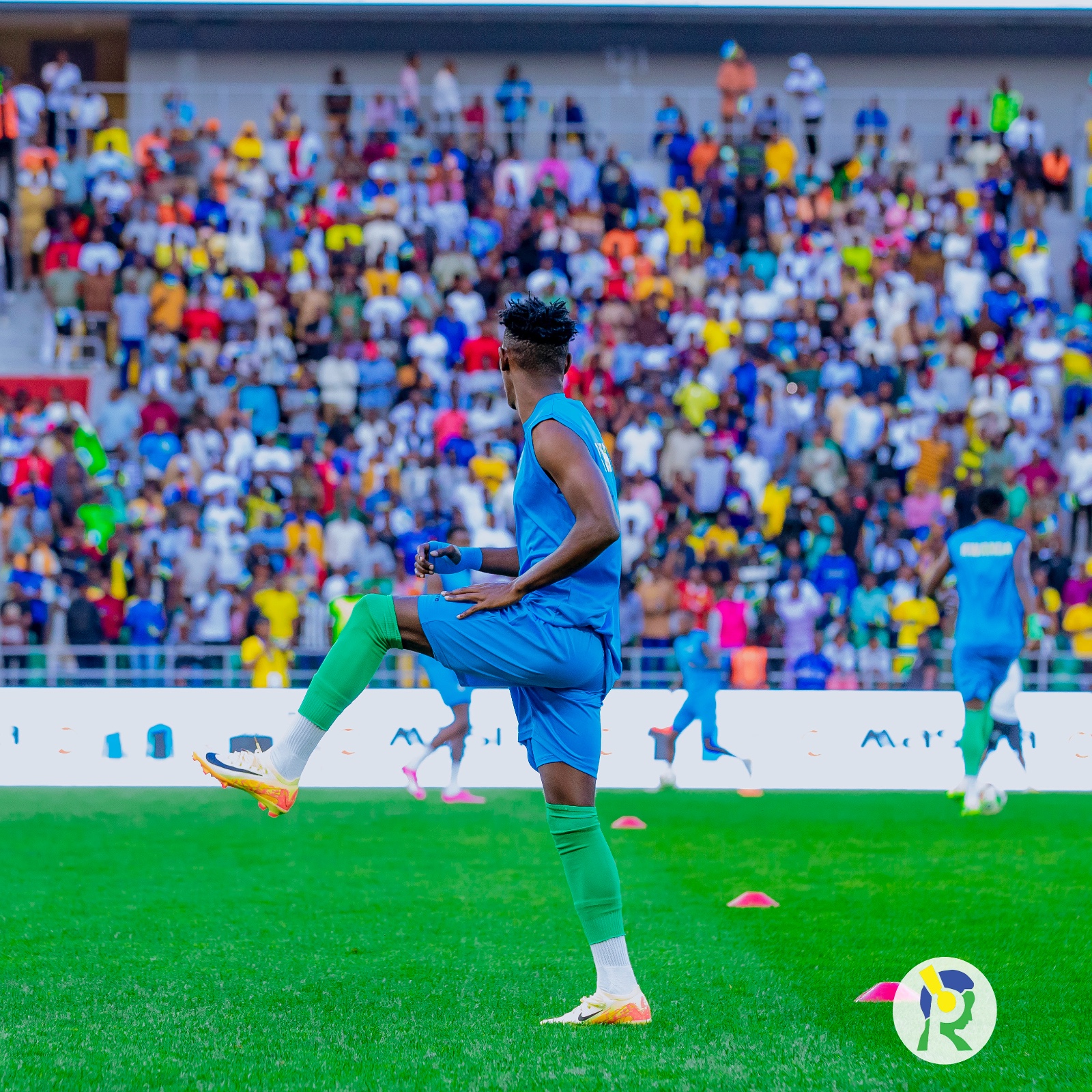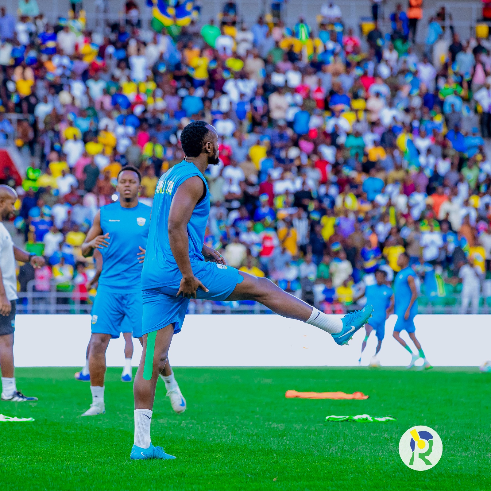 Abakinnyi b'u Rwanda ubwo bari bari kwishyushya mbere y'uko umukino utangira