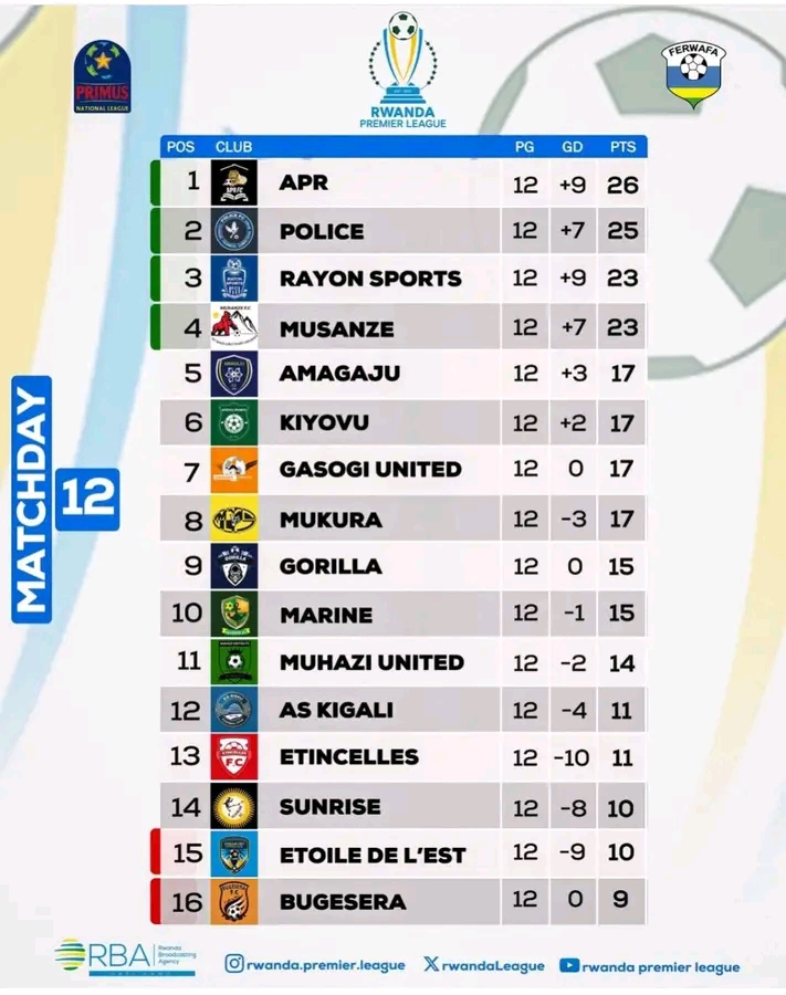 Muhazi United Iri ku mwanya wa 11 n'amanota 14 irushwa inota 1 na Gorilla na Marine mu gihe amakipe ya Mukura victory sports , Gasogi United na Kiyovu Sports n'Amagaju ayirusha amanota atatu .