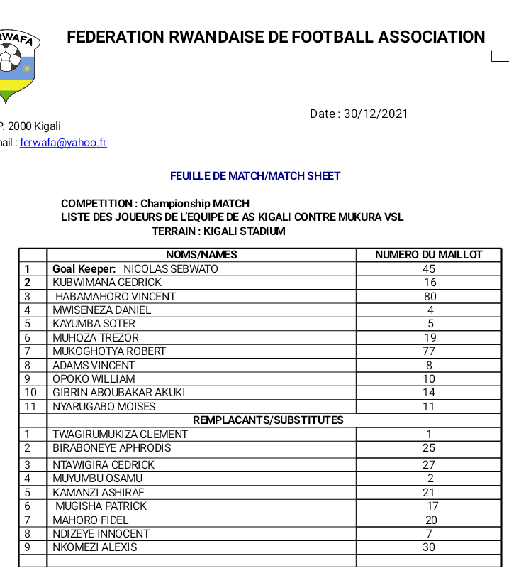Abakinnyi As Kigali yabanjemo. Bate Shamiru, Rukundo Denis, Ahoyikuye Jean Paul, Bishira Latif, Kwitonda Ally, Kayitaba Bosco, Kwizera Pierrot, Ndekwe Felex, Biramahire Abeddy, Hussein Shabani na Rugirayabo Hassan.