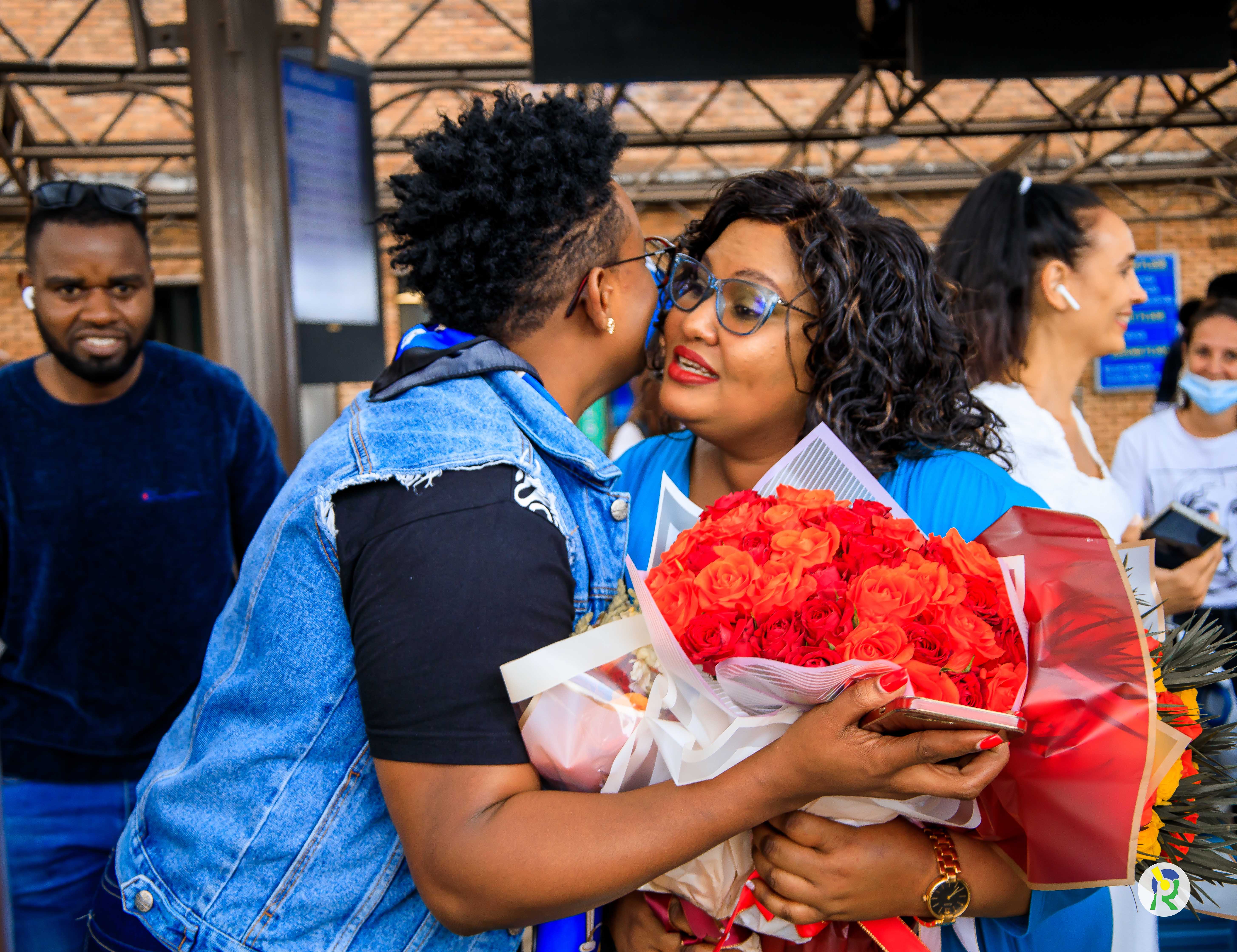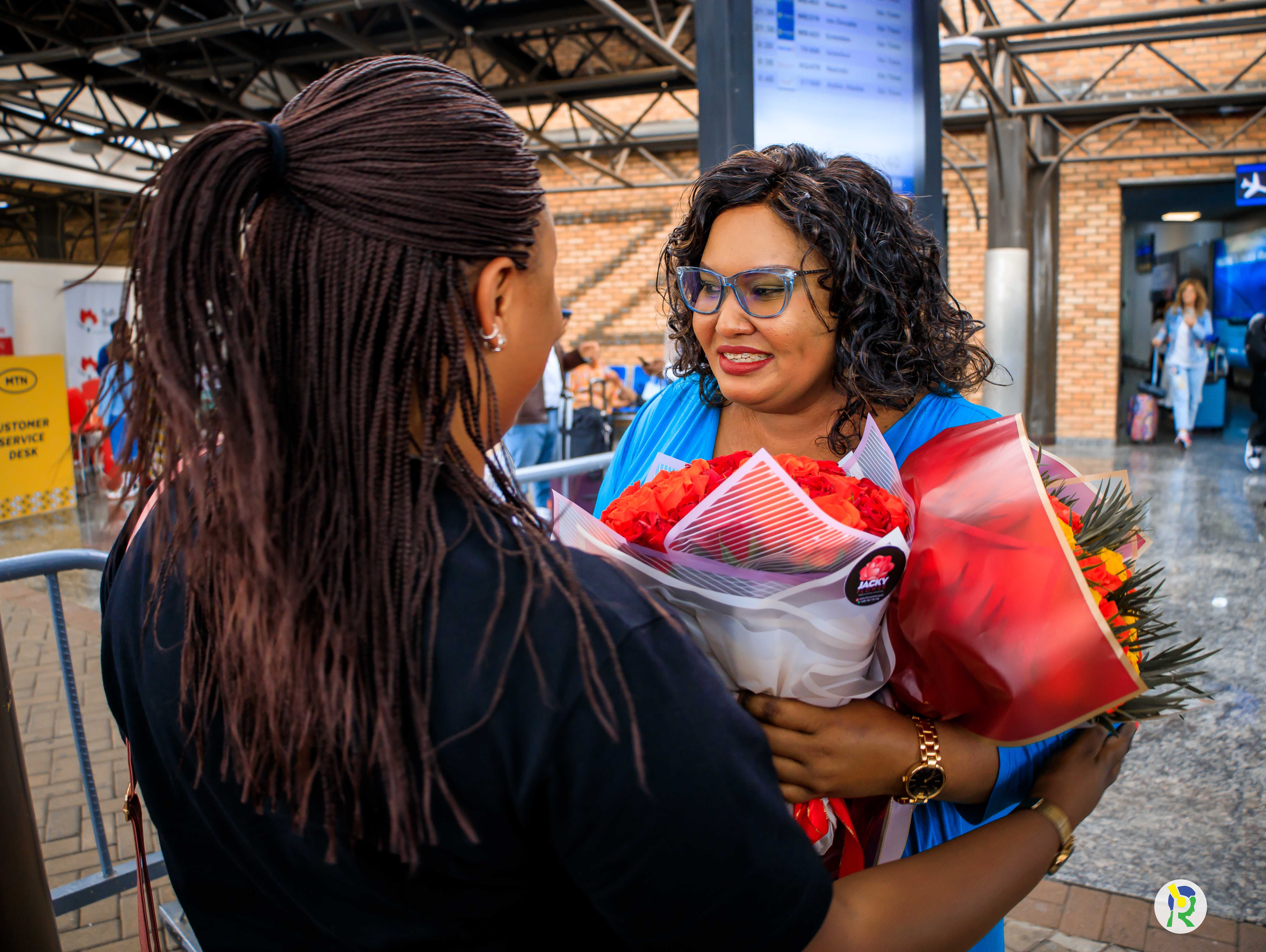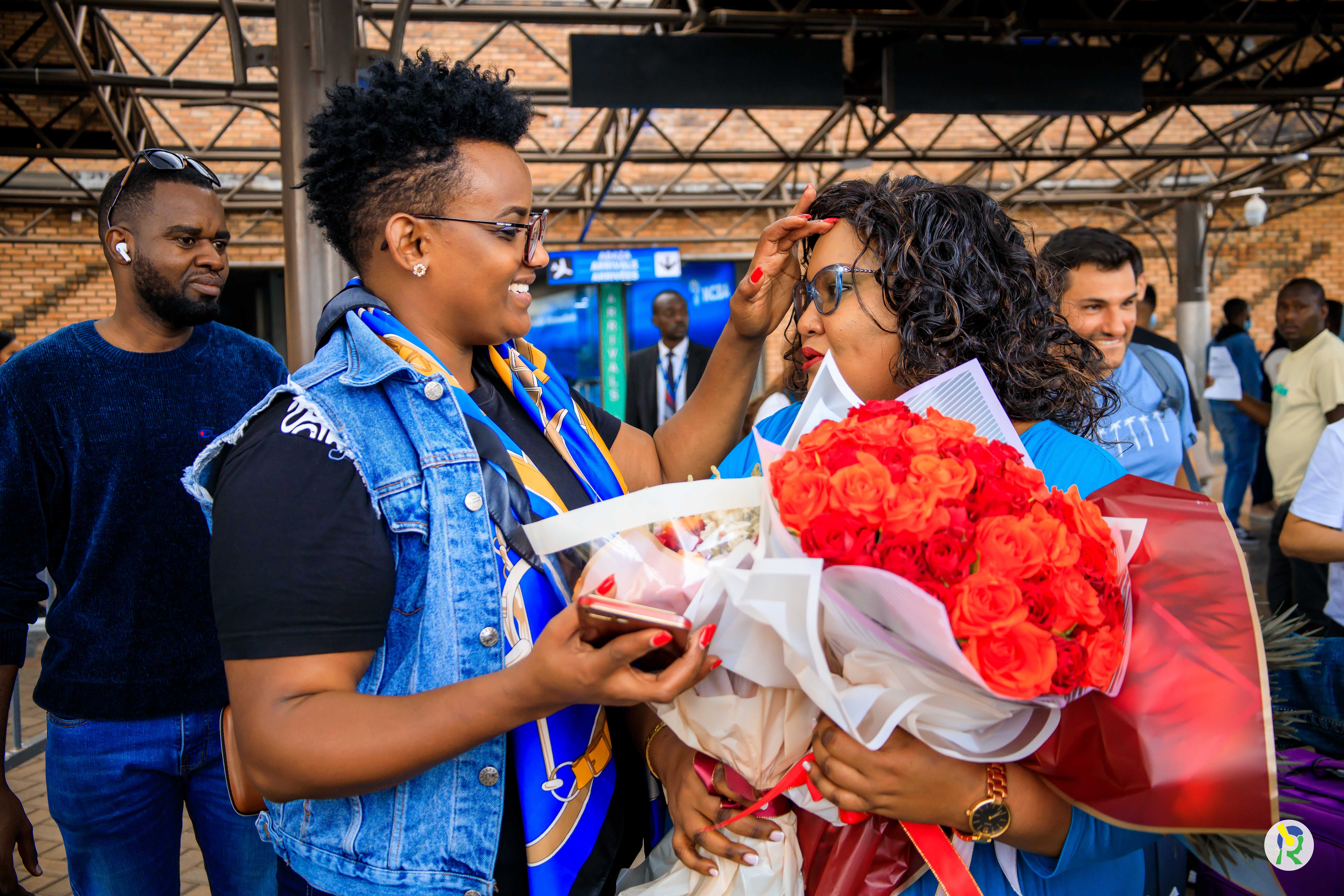 Mc Becky yakiriwe n'inshuti n’abavandimwe akigera ku kibuga cy'indege i Kanombe