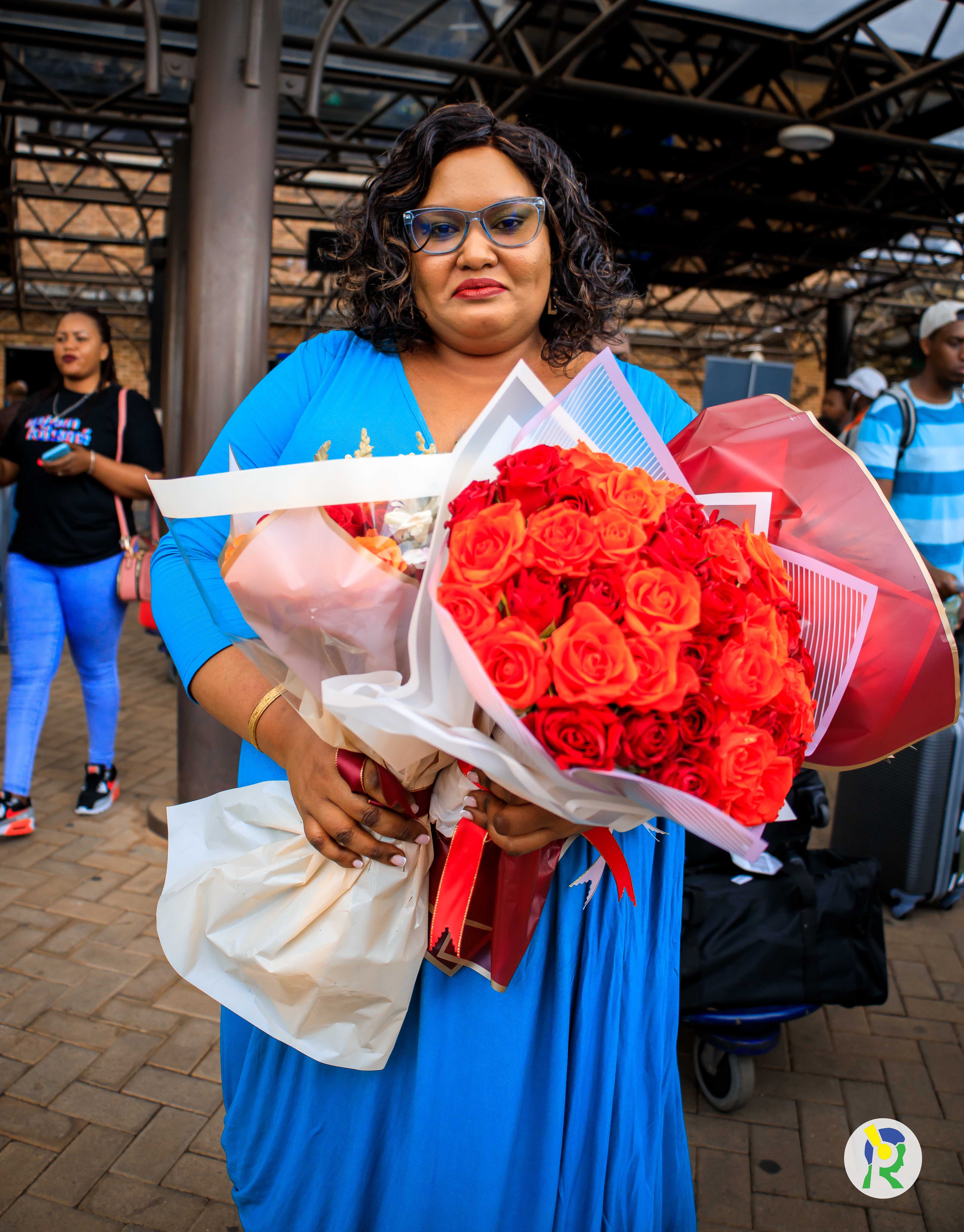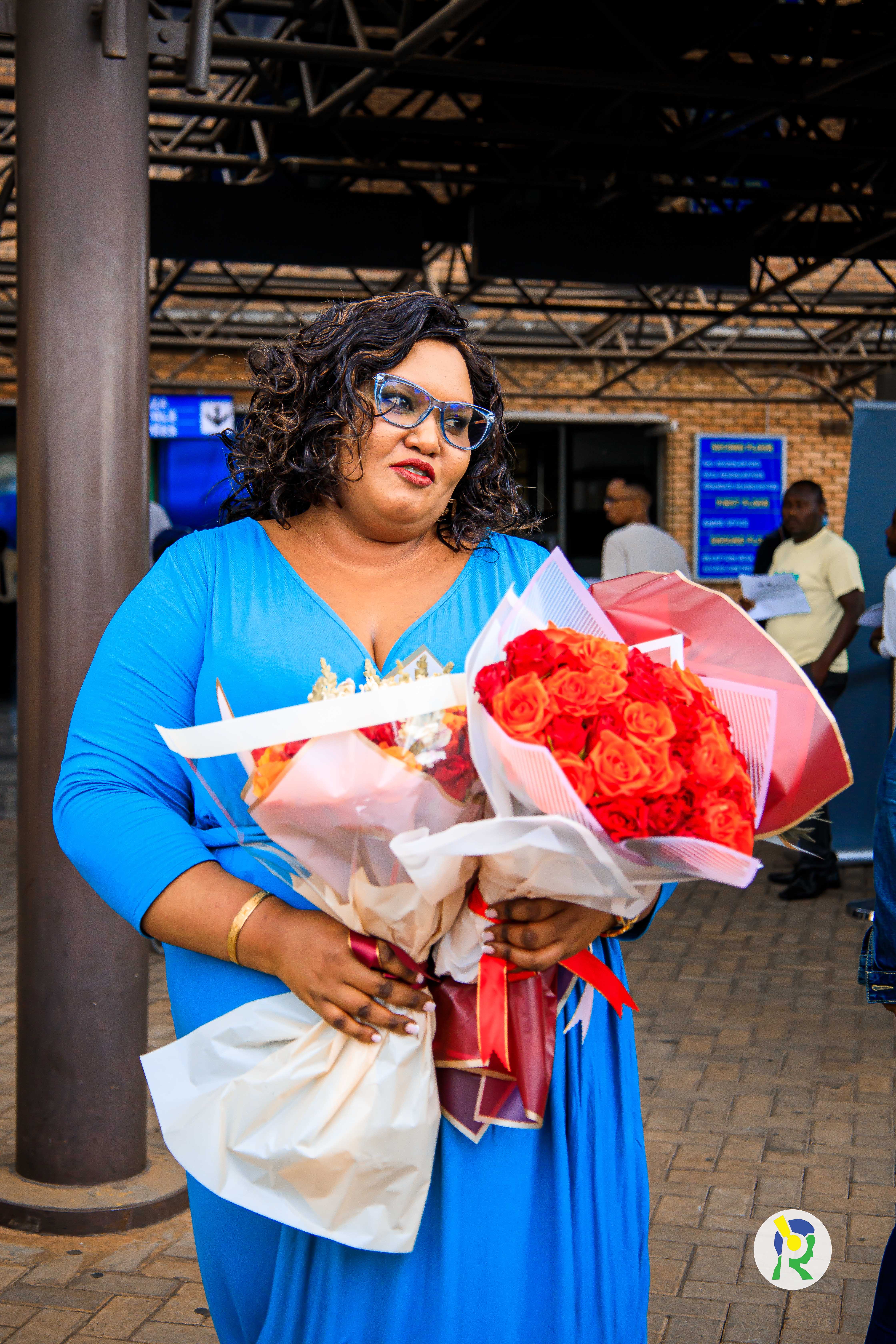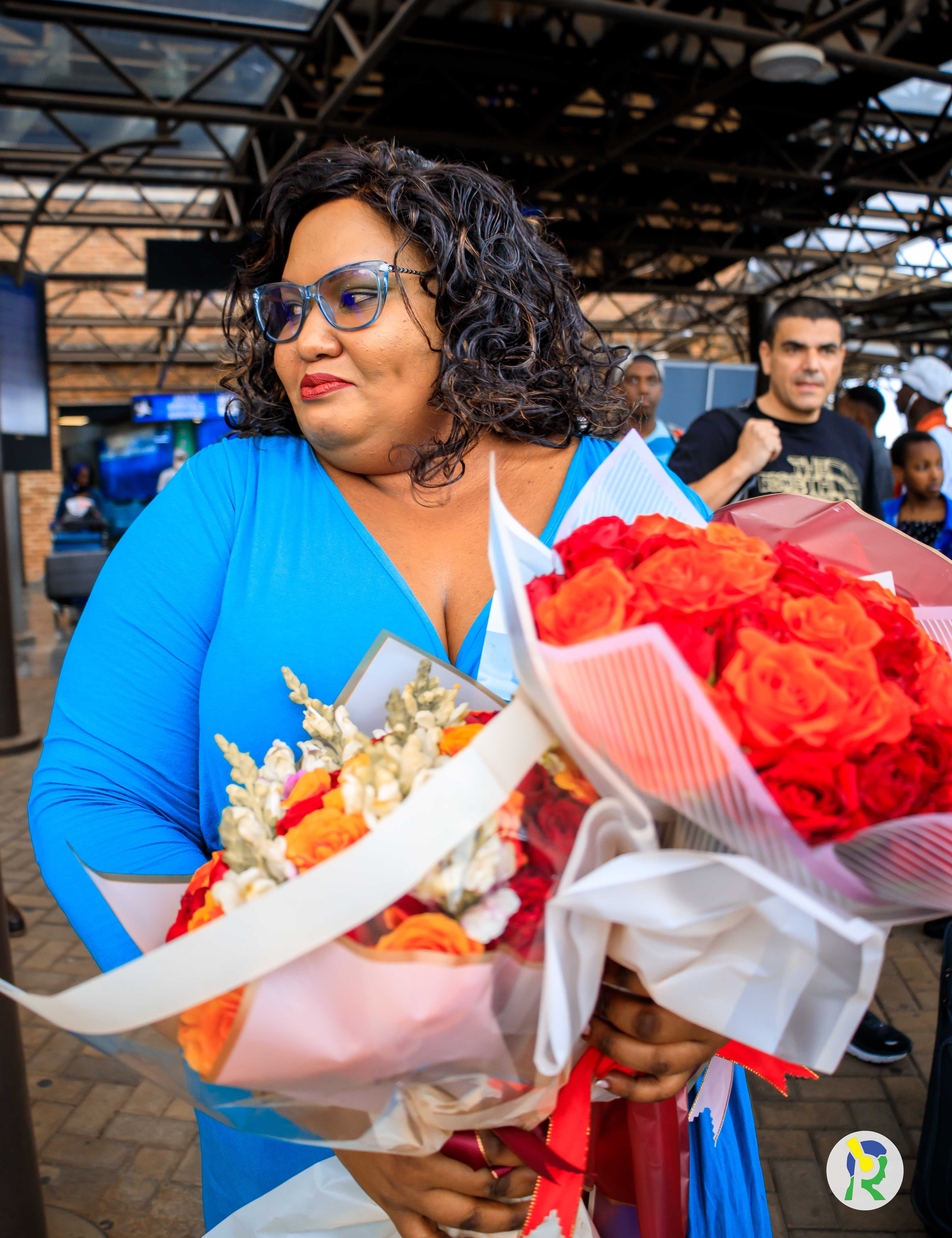 Mc Becky yakiriwe n'inshuti n’abavandimwe akigera ku kibuga cy'indege i Kanombe