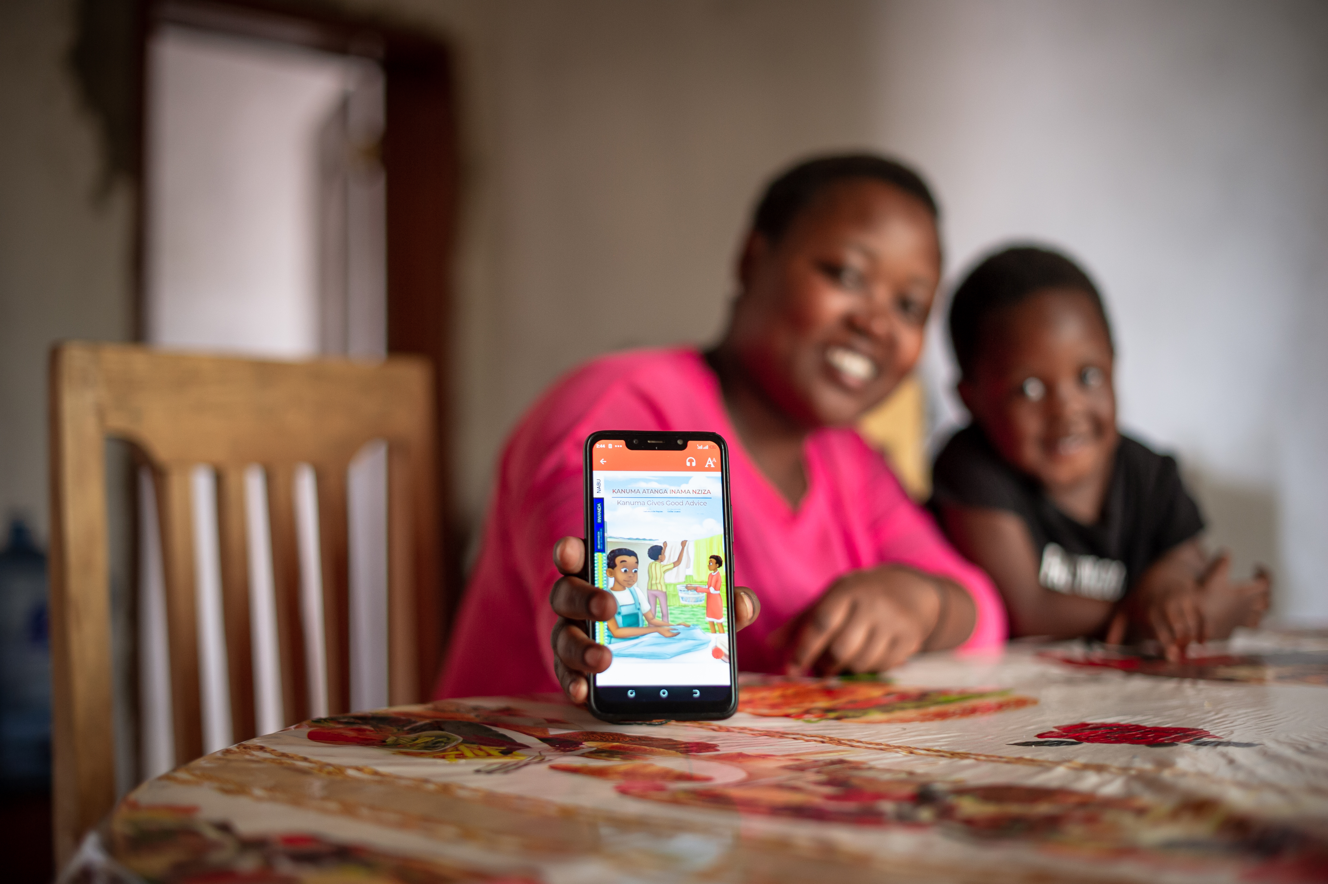 Umubyeyi ari gukoresha porogaramu ya NABU afasha umwana we gusoma ibitabo, inkuru n'ibindi
