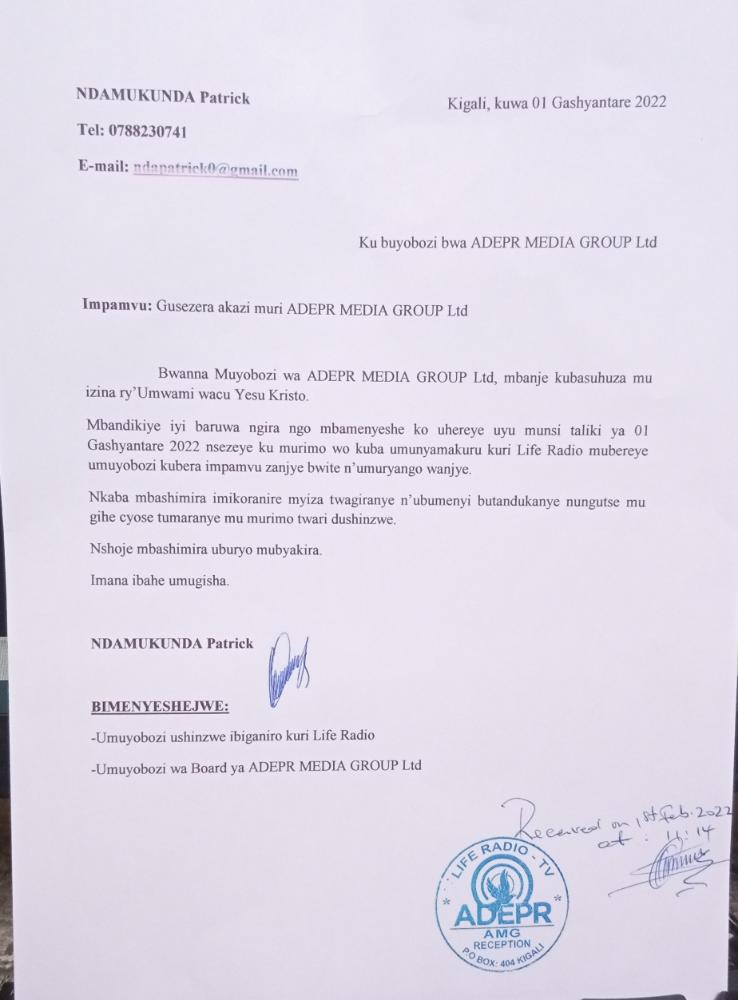 Kuri uyu wa Kabiri tariki 01 Gashyantare 2022 nibwo Ndamukunda Patrick yanditse ibaruwa isezera. Yabimenyesheje Umuyobozi ushinzwe ibiganiro kuri Life Radio n'Umuyobozi w'Inama y'Ubutegetsi ya ADEPR Media Group Ltd. Muri iyi baruwa dufitiye kopi, Ev Ndamukunda yagize ati "Bwana Muyobozi wa ADEPR Media Group Ltd, mbanje kubasuhuza mu izina ry'Umwami wacu Yesu Kristo. Mbandikiye iyi baruwa ngira ngo mbamenyeshe uhereye uyu munsi tariki ya 01 Gashyantare 2022 nsezeye ku murimo wo kuba umunyamakuru wa Life Radio mubereye umuyobozi kubera impamvu zanjye bwite n'umuryango wanjye".