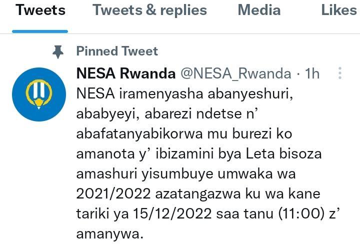 Iri tangazo rireba abanyeshuri, ababyeyi, abarezi ndetse n'abafatanyabikorwa mu burezi riragira riti: "NESA iramenyesha abanyeshuri, ababyeyi, abarezi ndetse n'abafatanyabikorwa mu burezi ko amanota y'ibizamini bya Leta bisoza amashuri yisumbuye umwaka wa 2021-2022 azatangazwa kuwa Kane tariki ya 15/12/2022 saa tanu (11:00') z'amanywa".