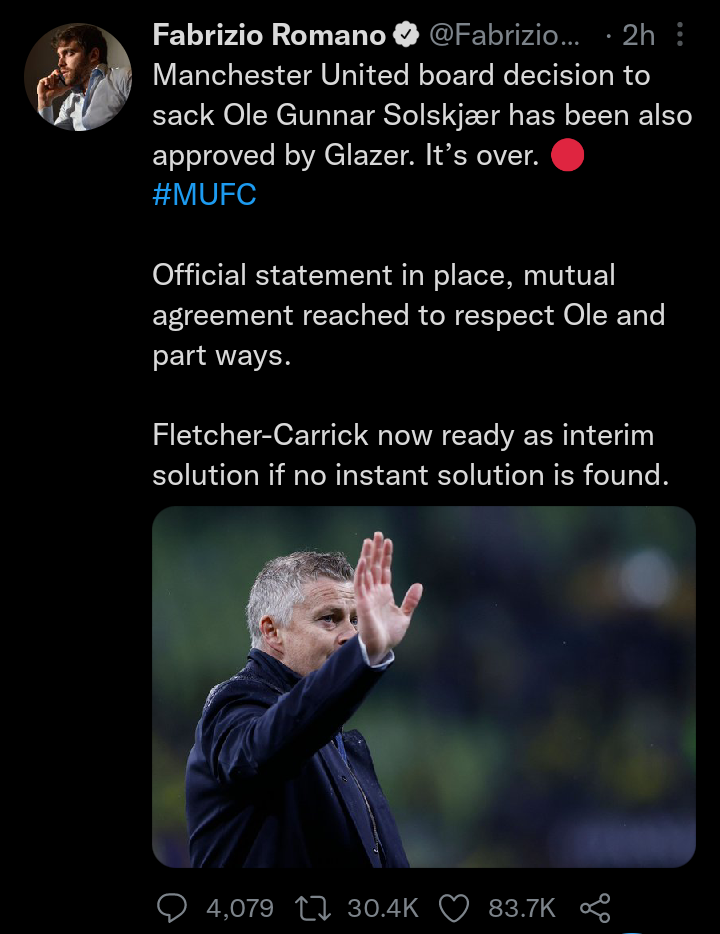 Amakuru dukesha Fabrizio Romano, yemeje ko umuryango wa Glazer wari umaze igihe utsimbaraye kuri uyu mutoza, wamaze kwemera ko Ole Gunnar Solskaer asezererwa nyuma yo kutagaragaza impinduka no kwisubiraho, Fabrizio Romano akomeza avuga ko hategerejwe itangazo risezerera uyu mutoza mu masaha aza kuza.