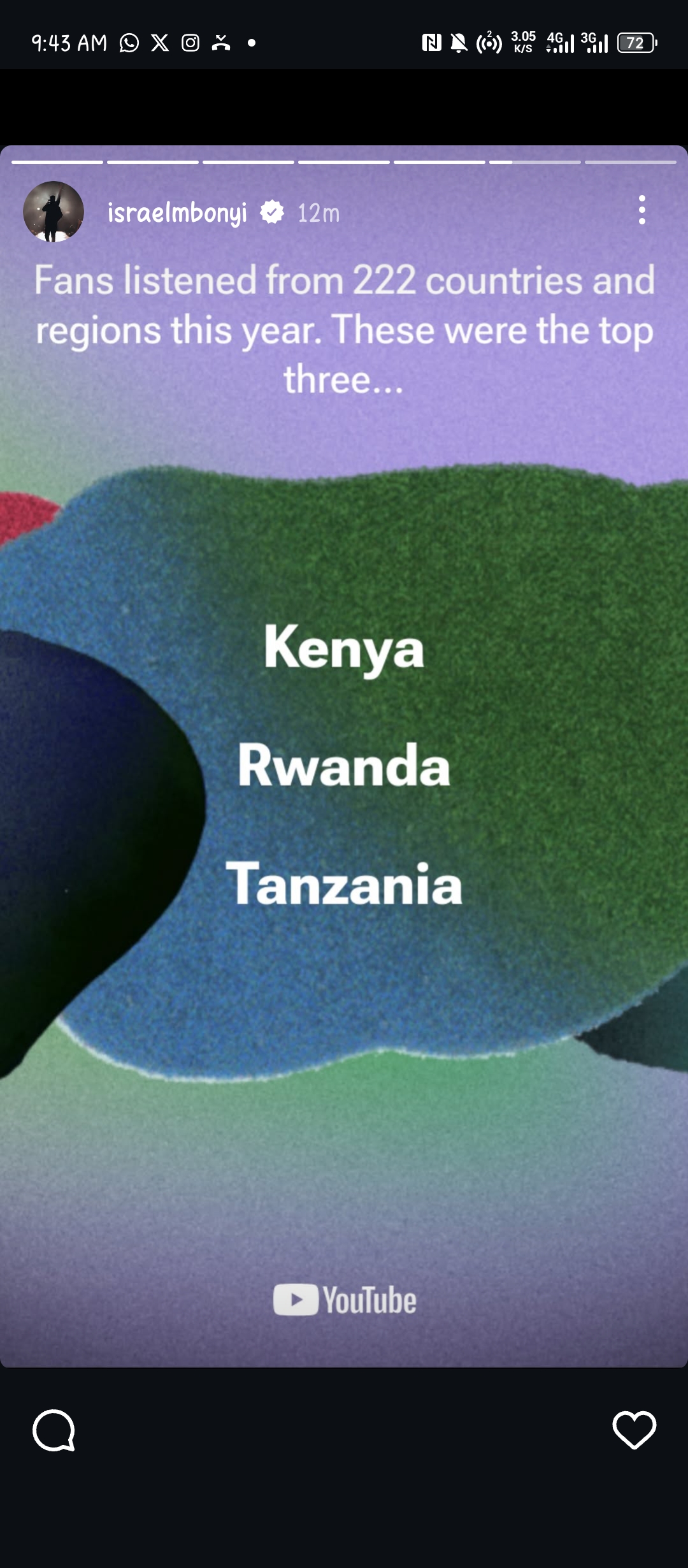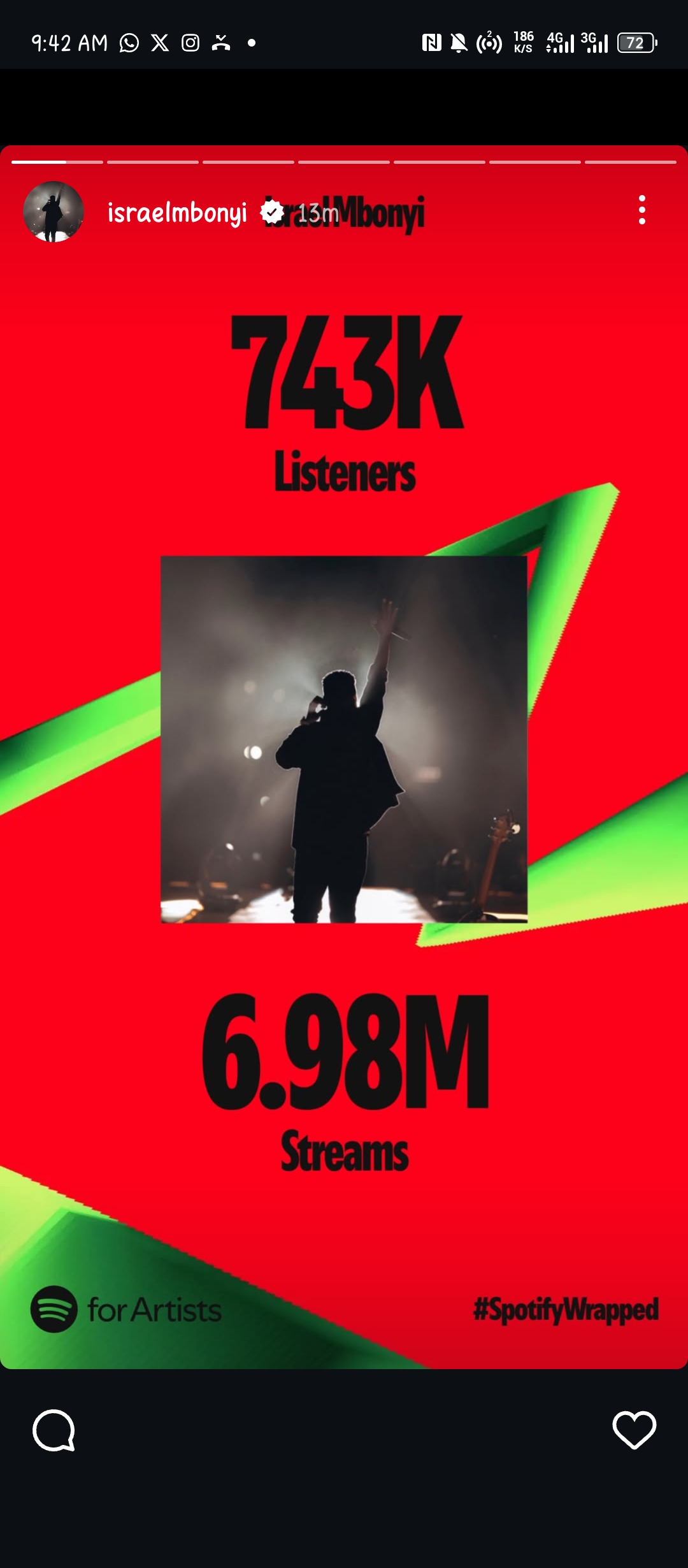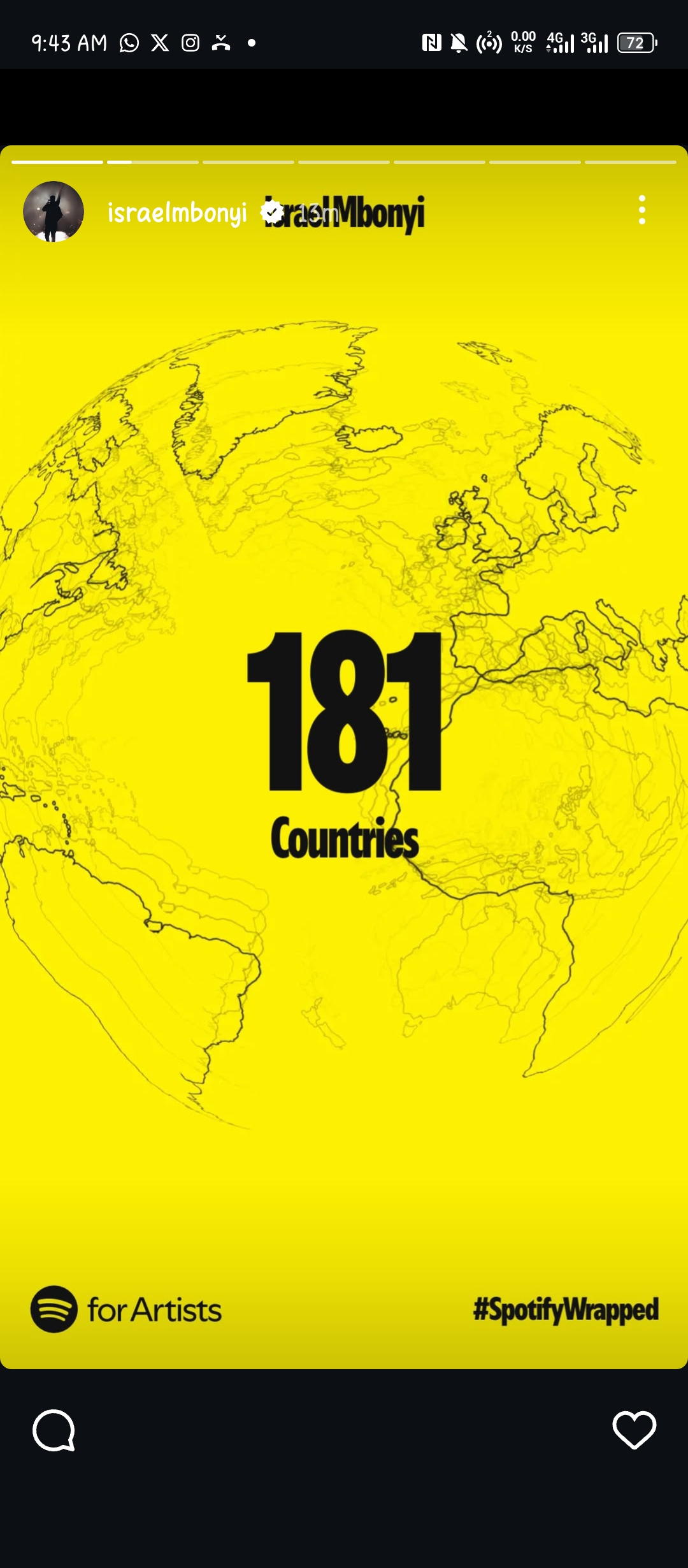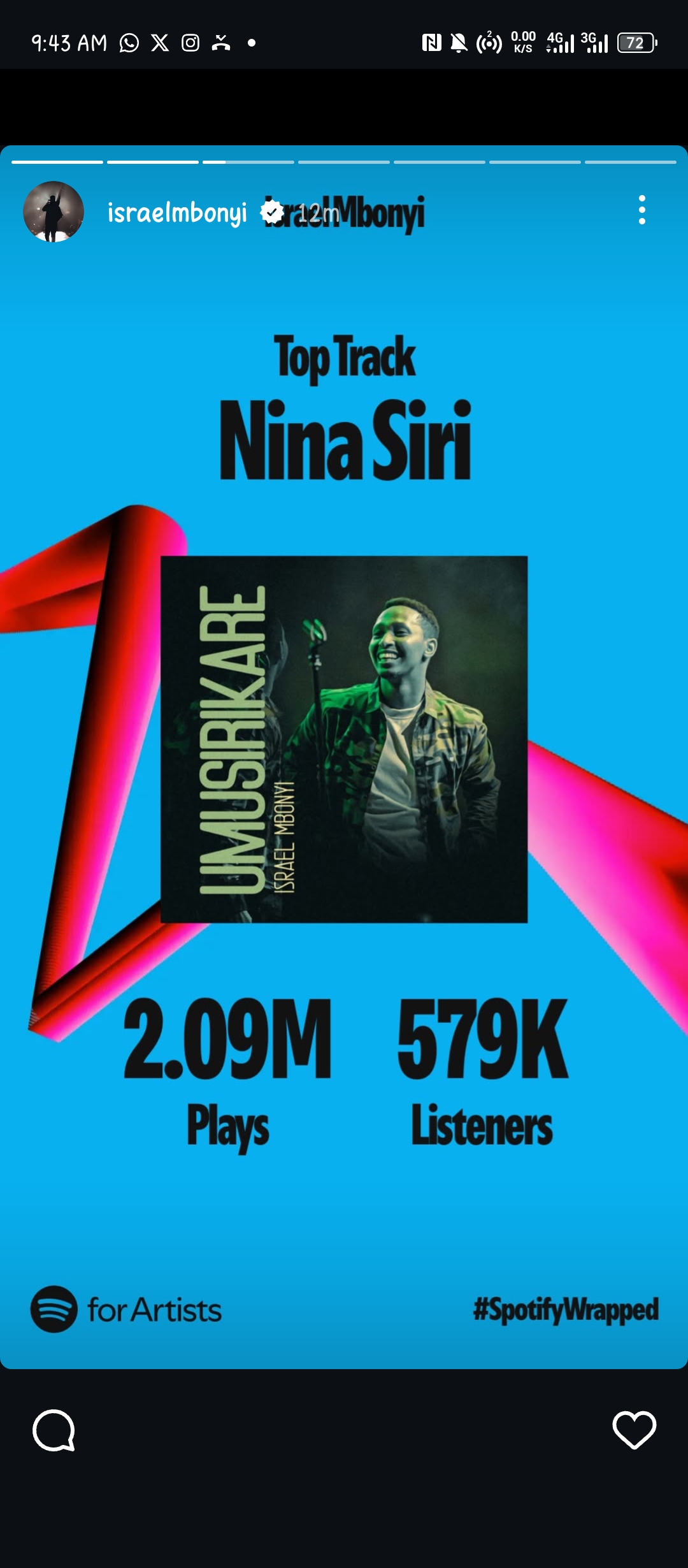 Ku rubuga rwa Spotify rudakoreshwa cyane mu Rwanda, uyu muhanzi afite streams Miliyoni 6.9 aho yumviswe n’abantu barenga 743,000. Aba bantu bose, ni abaturuka mu bihugu 181 byo ku Isi hose.