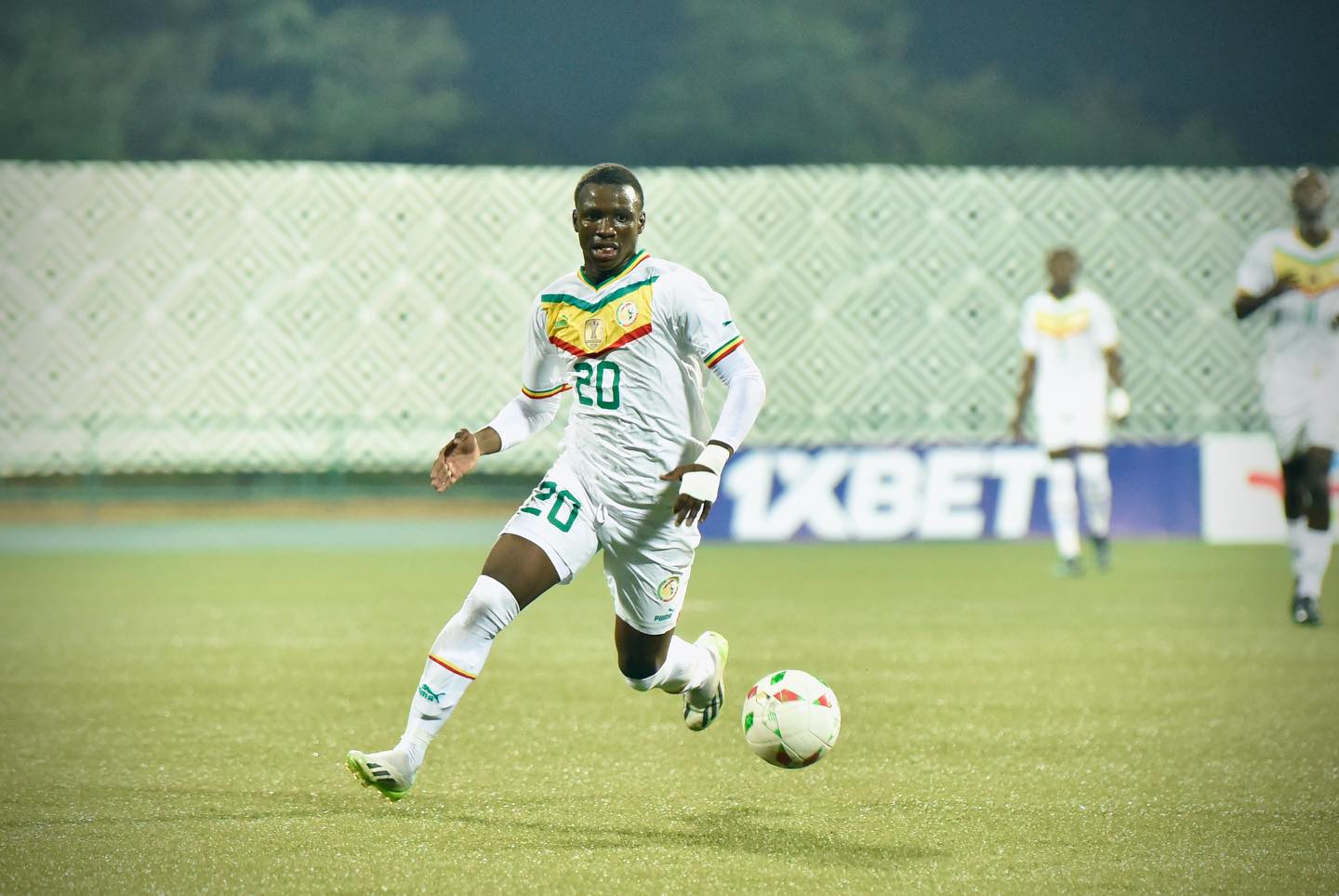 Amara Diouf ari mu kibuga cya sitade mpuzamahanga ya Huye yandikiyeho amateka yo kuba umukinnyi ukiri muto ukiniye ikipe y'igihugu nkuru