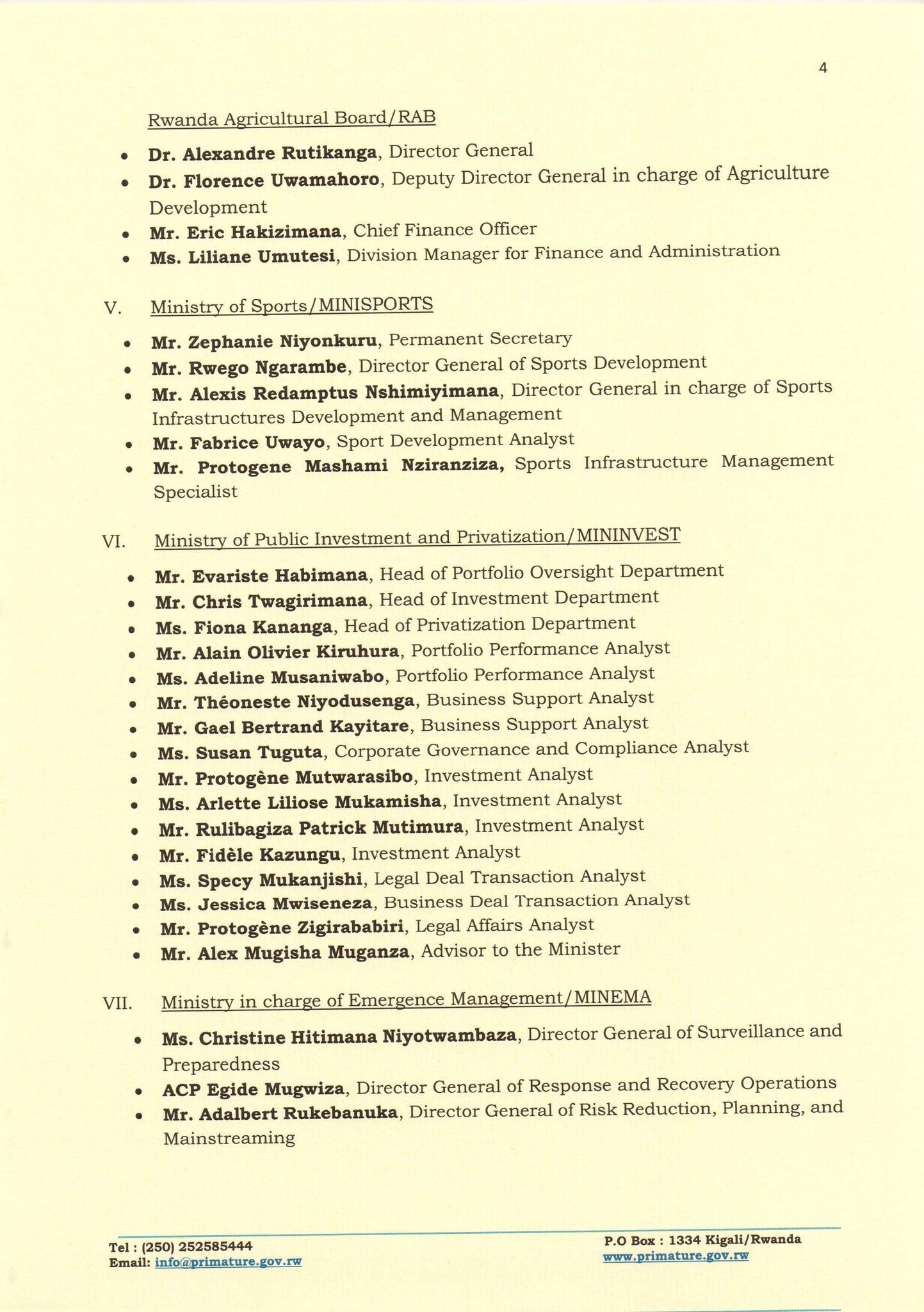 Kuri gatanu cyangwa se V hariho abayobozi bahawe imyanya muri Minisiteri ya siporo