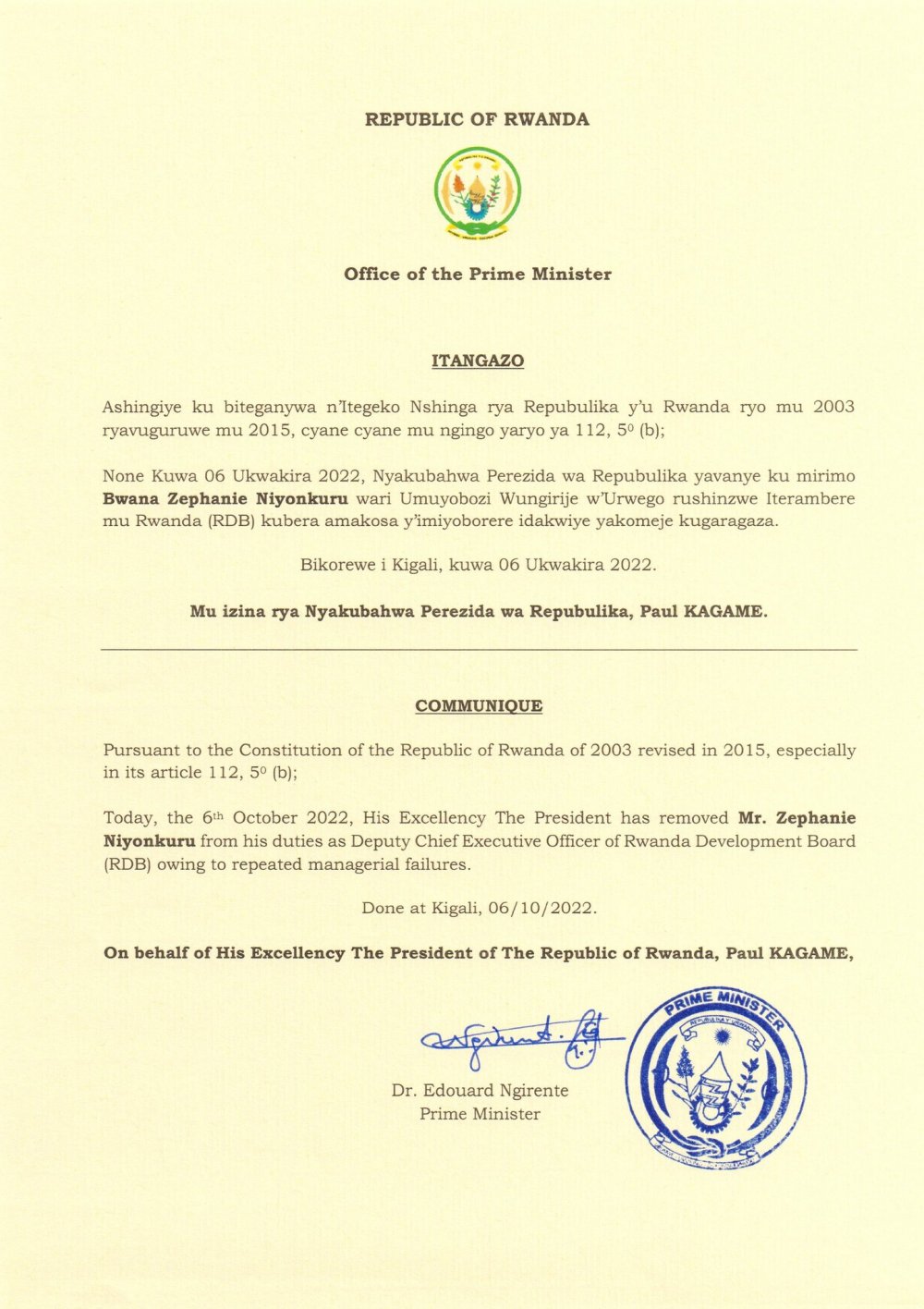 Nyuma y'imyaka 2 gusa, tariki 6 Ukwakira, Perezida Paul Kagame yaje guhagarika mu nshingano Niyonkuru Zephanie kubera amakosa yagiye akora mu bihe bitandukanye ndetse kuva icyo gihe akaba atari yagahawe indi mirimo.