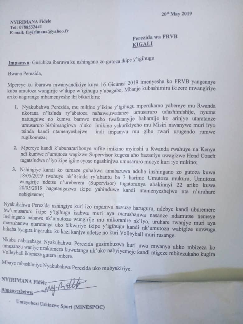 Ingingo ya mbere iri muri iyi baruwa, Nyirimana avuga ko ubwo aheruka mu mirimo y’ikipe y’igihugu ya Volleyball abo bakoranaga muri iyi mirimo bamureze mu buyobozi bukuru bavuga ko ariwe watumye ikipe ititwara neza nyuma aza kuvanwa mu batoza bagiye mu Misiri atabimenyeshejwe.