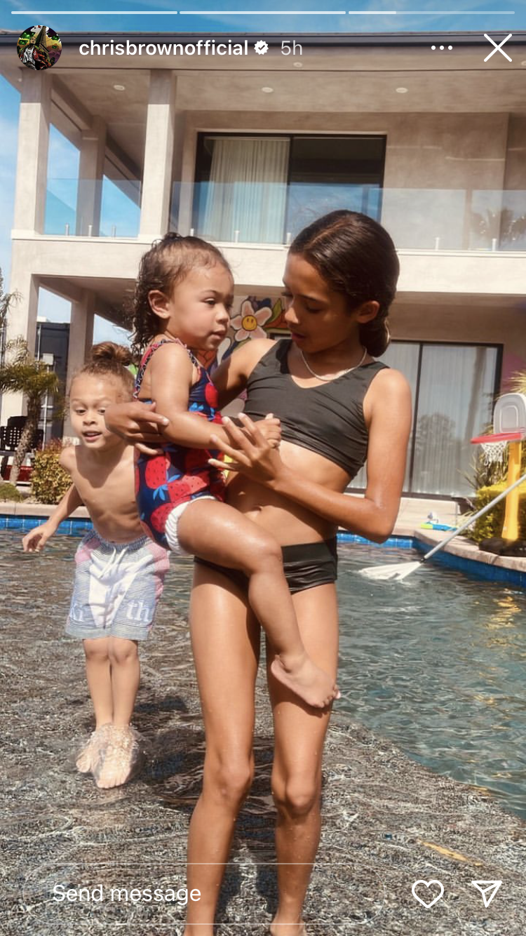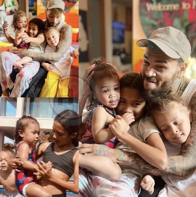 Abana ba Chris Brown uko ari batatu yabyaranye n'abagore 3 batandukanye, aribo imfura ye Royalty Brown, Aeko Brown hamwe na Symphany Brown bose bagiranye ibihe byiza na Se nk'uko amafoto yashyize hanze yabigaragaje aho bishimanye bakanogana muri pisine iri mu rugo rw'uyu muhanzi.