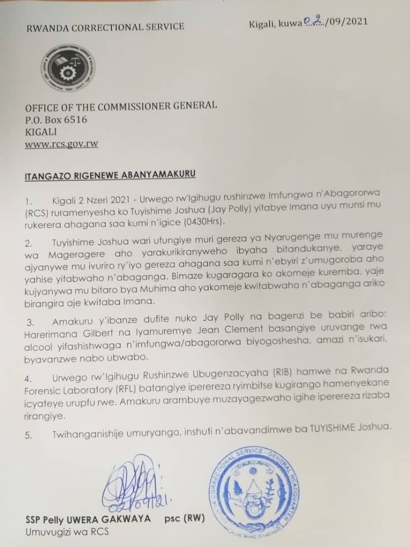RCS ivuga ko Jay Poly "yaraye ajyanywe mu ivuriro ry'iyo gereza ahagana saa kumi n'ebyiri z'umugoroba aho yahise yitabwaho n'abaganga.' Iri tangazo rikomeza rivuga riti: "Bimaze kugaragara ko akomeje kuremba yaje kujyanywa mu bitaro bya Muhima aho yakomeje kwitabwaho n'abaganga ariko birangira aje kwitaba Imana".