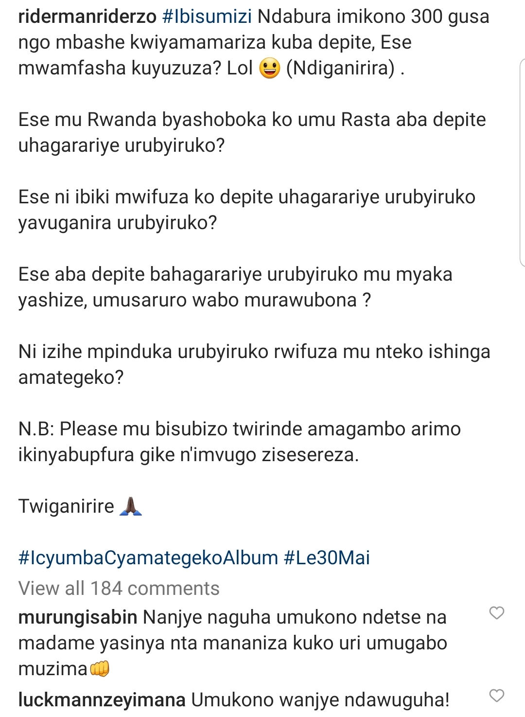 Iyi ngingo ntabwo iri kure y’ibyo Riderman yakomojeho mu butumwa bwarikoroje ku mbuga nkoranyambaga, aho yagaragaje ko hari inyunganizi ikenewe. Yatangiye atera