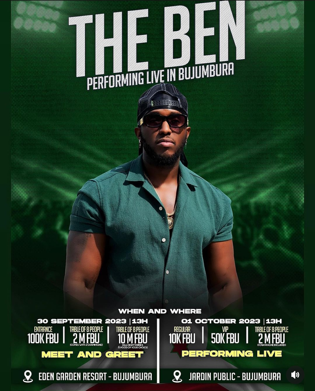 Umuhanzi Mugisha Benjamin uzwi ku mazina ya The Ben ategerejwe mu gitaramo gikomeye azakorera mu Burundi ku wa 30 Nzeri 2023 ndetse na 01 ukwakira 2023.