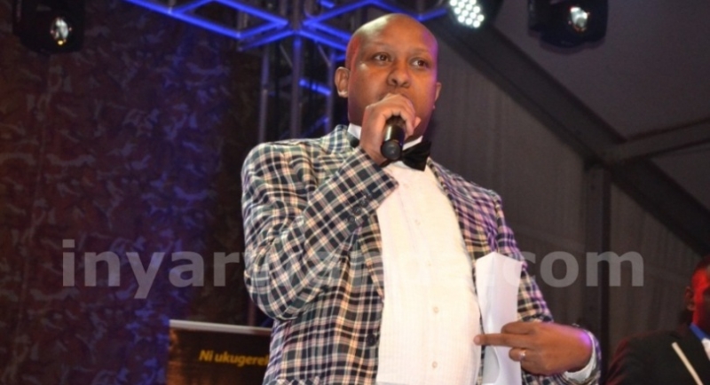 Alex Muyoboke ateruye igikombe yahawe ku bwo guteza imbere muzika