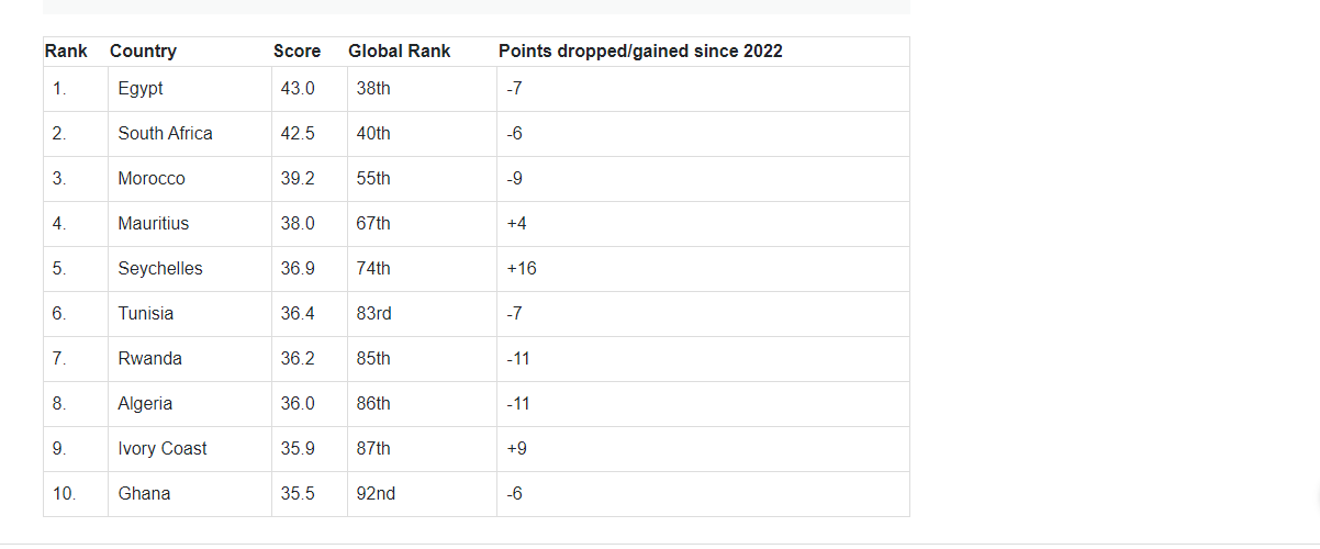 Dore urutonde rw'Ibihugu bikomeye muri Afurika harimo n'u Rwanda nk’uko tubisanga kuri iyi mbonerahamwe ikurikira: ku mwanya wa mbere haza Egypt igakurikirwa na South Africa, Morocco, Mauritius, Seychelles, Tunisia, u Rwanda ruza ku mwanya wa karindwi, Algeria, Ivory coast na Ghana.