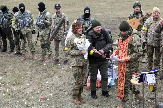 Uyu mugore Lesya yasezeye mu kazi ke yakoraga ka burimunsi maze ajya gufatanya n’abandi ku rugamba mu rwego rwo kurinda agace atuyemo kuva intambara yo muri Ukraine yatangira mu kwezi gushize. Aba bombi basezeranyijwe n’umusirikare mugenzi wabo wo mu idini rwa Orthodox risengerwamo n’abantu batari bacye muri Ukraine.