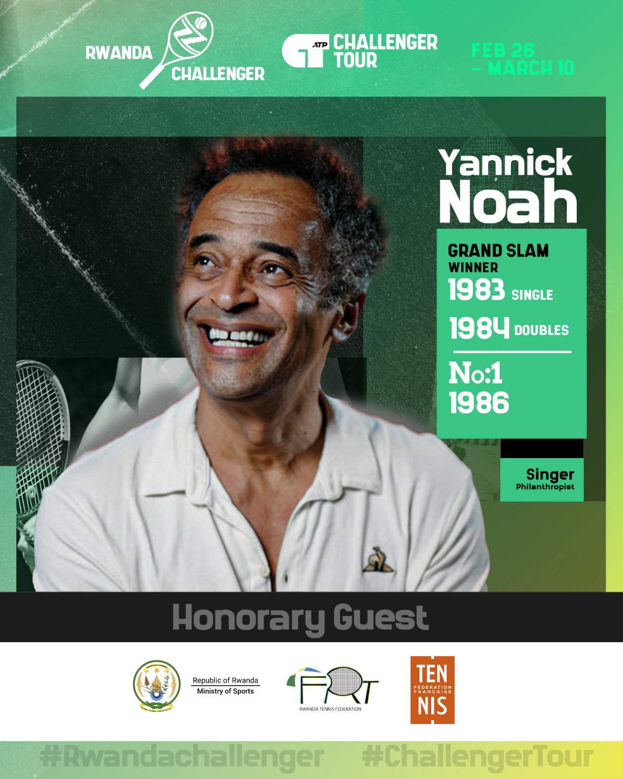 Binyuze mu ishyirahamwe ry'umukino wa Tennis mu Rwanda, hatangajwe ko Yannick Noah ukomoka mu Bufaransa azaba ari mu Rwanda nk'umwe mu bashyitsi bakuru bazihera ijisho iri rushanwa.