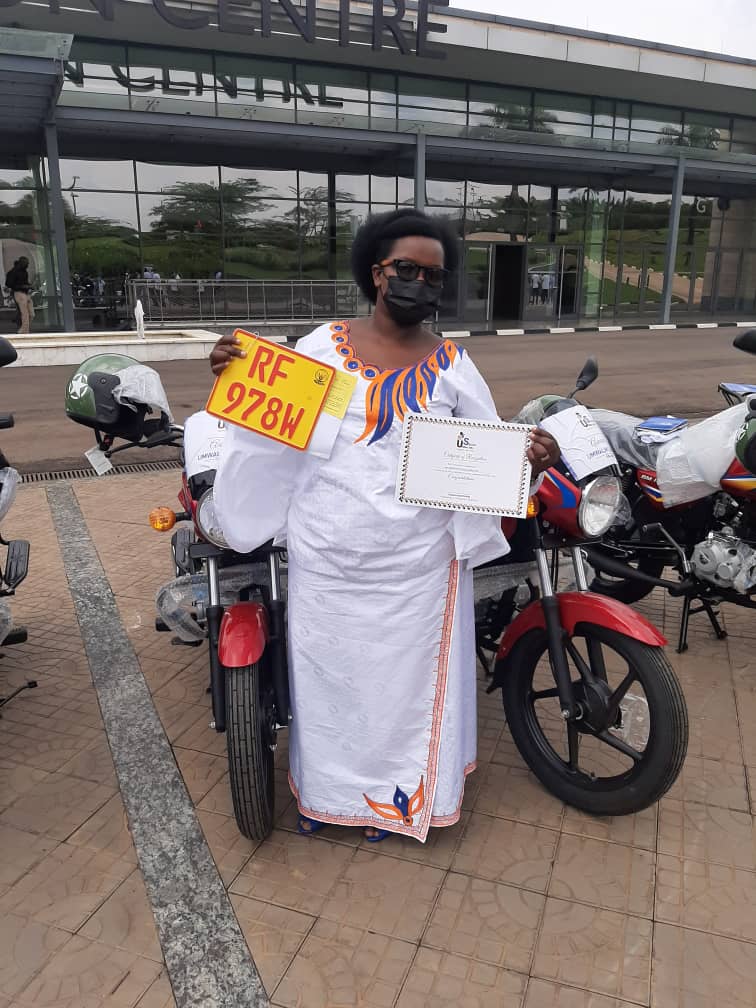 Stella Manishimwe ari kubyinira ku rukoma nyuma yo guhembwa moto