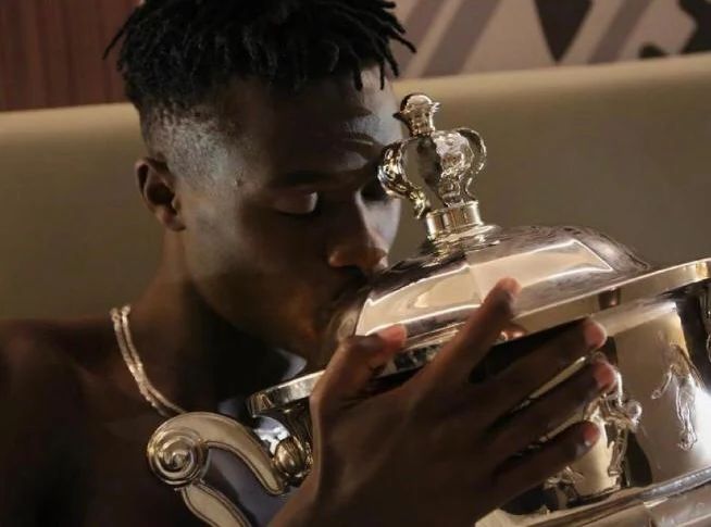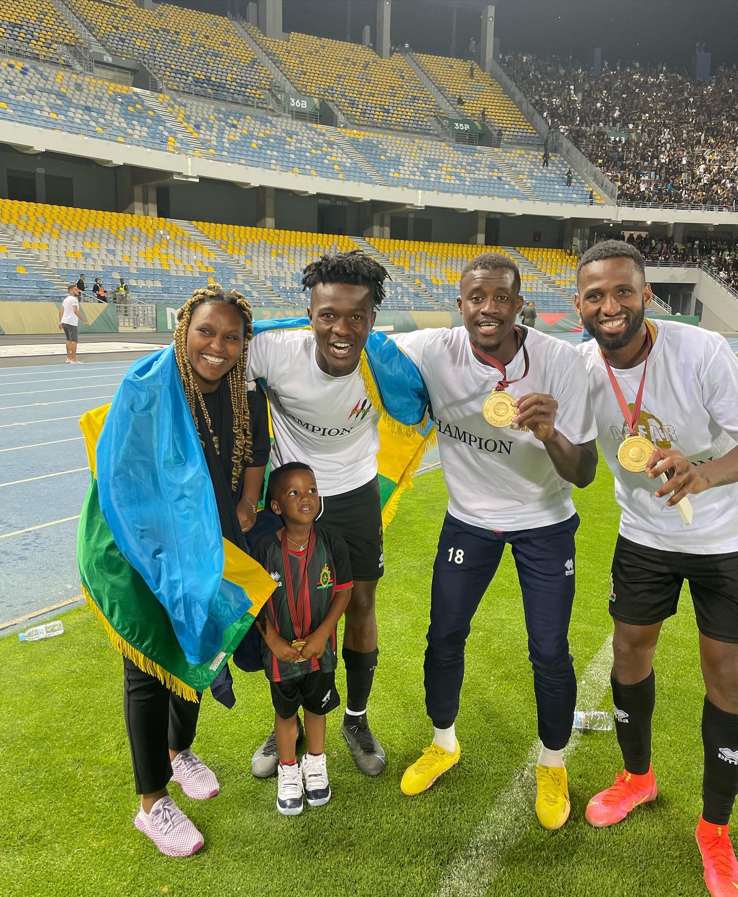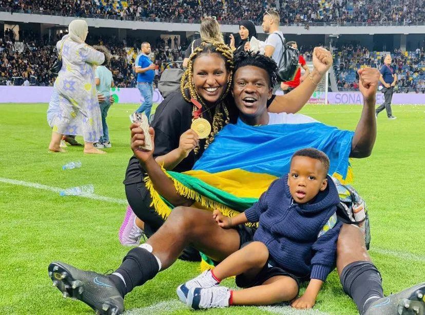 Manguende ari kumwe n'umufasha we n'umwana we bifotoza nyuma yo kwegukana igikombe