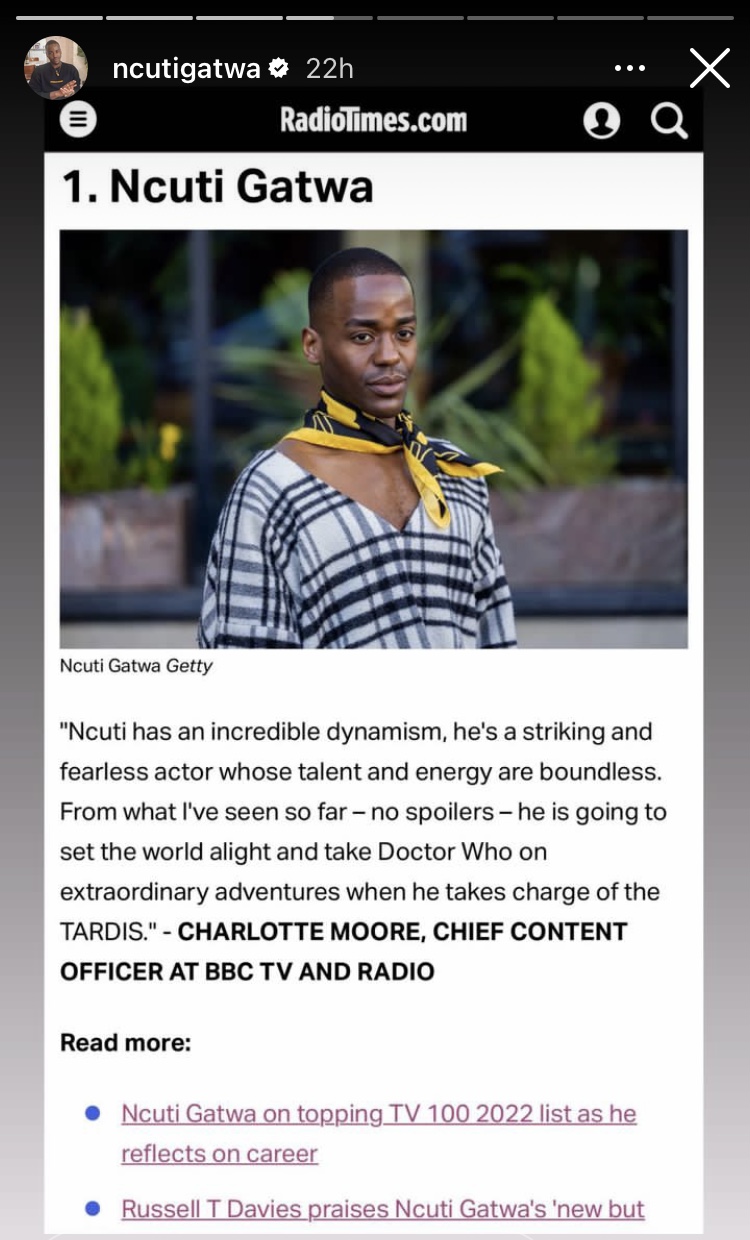 Uru rutonde TV100 rukorwa na RadioTimes, Ncuti Gatwa yaje kuri uyu mwanya nyuma yo kugaragara muri filime nka Sex Education akina yitwa Eric Effiong ndetse ategerejwe mu gice cya 15 cya filime y’uruhererekane ya BBC yiswe Doctor Who.
