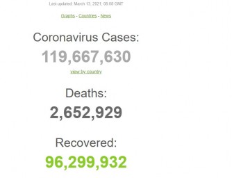Ku rwego rw’Isi abantu bagera kuri 119,667,630 nibo bamaze kwandura Covid-19, naho abagera kuri 96,299,932 baraize, bivuze ko 80.4% y'abarwaye bose bakize naho abagera kuri 2,652, 929 yarabahitanye. Magingo aya igihugu kiri ku Isonga mu kwibasirwa na Covid-19 ni Leta Zunze Ubumwe za America aho ifite 25% y'abarwayi bose ku Isi b'iki cyorezo naho ikagira 20.5% y'abapfuye nk'uko imibare iri ku rubuga rwa worldmetrics ibigaragaza