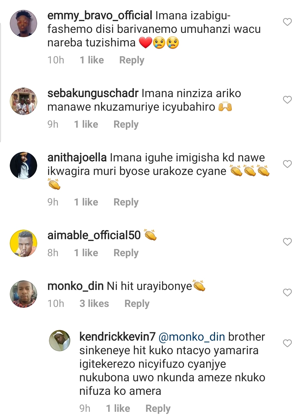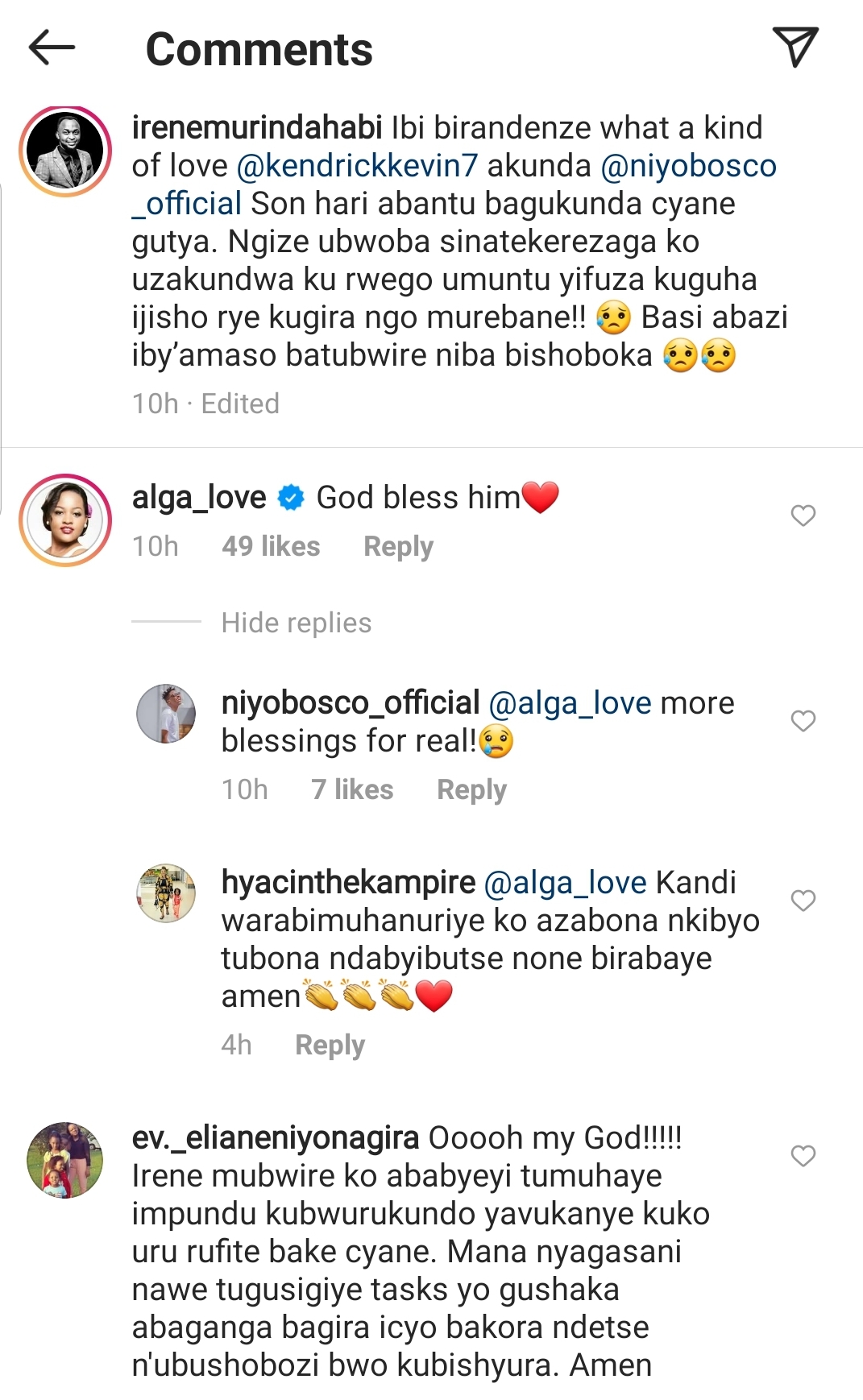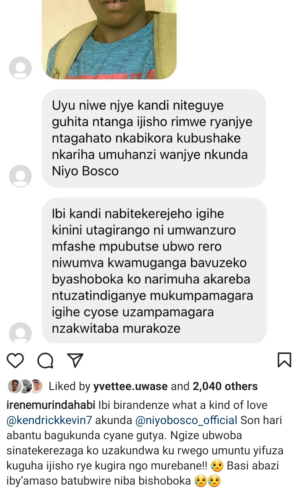 Ubwo yashyiraga ubu butumwa ku rukuta rwe rwa Instagram, Irene Murindahabi umujyanama (Manager) wa Niyo Bosco yagize ati "Ibi birandenze what a kind of love Kendrick Kevin akunda Niyo Bosco. Muhungu wanjye, hari abantu bagukunda cyane gutya. Ngize ubwoba sinatekerezaga ko uzakundwa ku rwego umuntu yifuza kuguha ijisho rye kugira ngo murebane. Basi abazi iby'amaso batubwire niba bishoboka."
