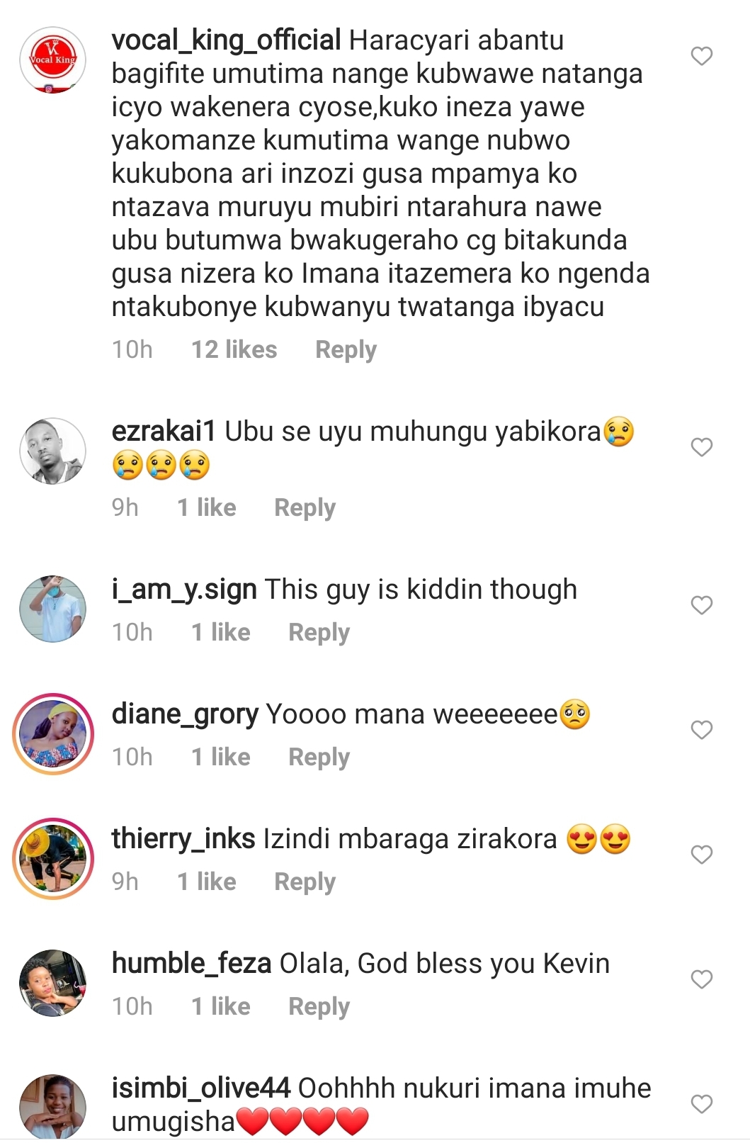 Umwari Peru ati " Yoooh Imana imuhe umugisha mwinshi kuba yanabitekereje byonyine birakomeye". Dorcas Ikirezi yasabye Kevin kutazamera nk'abantu b'iki gihe batakaje ubumuntu, ati "Imana iguhe umugisha mama kandi komereza aho ntuzabe nk'ab'iki gihe kuko uracyafite ubumuntu". Esther Neissa yavuze ko ibyo Kevin akoze bisobanuye urukundo nyarwo, ati "Mana we, icyo ni igikorwa gisobanura urukundo nyarwo, ni ukuri Uwiteka abiguhere umugisha pe." Irafasha Eliab ati "Uru ni rwo rukundo dusabwa twese, kunda mugenzi wawe nk'uko wikunda, ndabikunze".