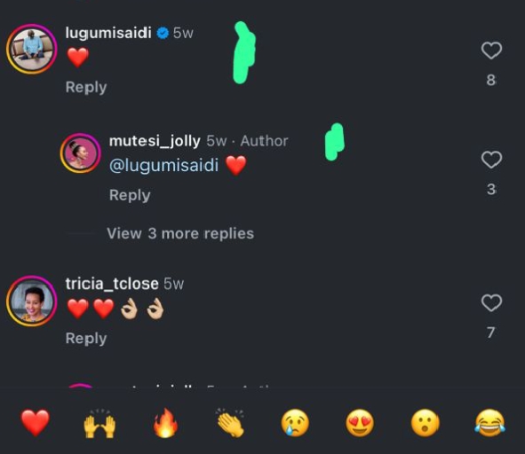 Ni ubutumwa bwanyujijwe ku rubuga rwa Instagram aho Lugumi yanditse ngo "Warakoze kunkunda." Hanyuma Mutesi Jolly asubiza agaragaza ko ibintu bimeze neza.