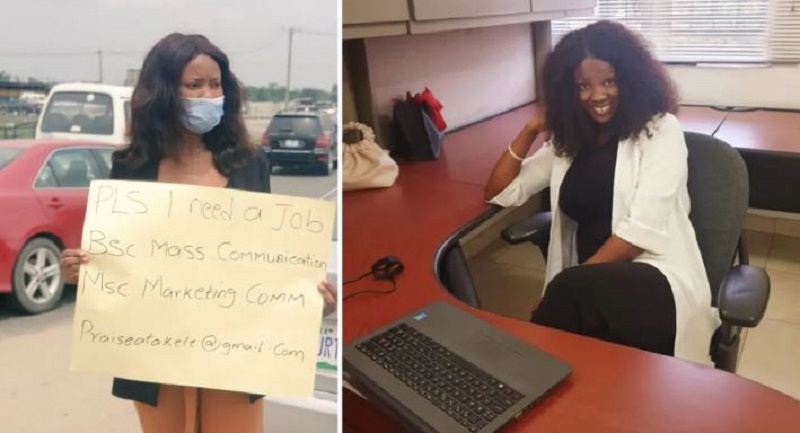 Mu nkuru ya Legit ivuga ko umukobwa wabitinyutse ubu afite akazi keza nk'uko yabitangaje ku mbuga nkoranyambaga. Uyu mukobwa witwa Praise Atakele yari yagiye ahagaragara muri Werurwe 2021 ubwo yafatwaga afite ikarito yayikozemo icyapa ayifata mu ntoki mu mihanda ya Abuja asaba akazi. Ku wa kabiri, 20 Mata 20221, Atakele ufite impamyabumenyi y'ikirenga mu itumanaho no kwamamaza, yasangije abantu ifoto yo mu biro yicayemo yambaye imyenda y'akazi amwenyura.