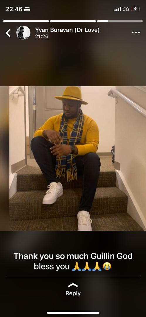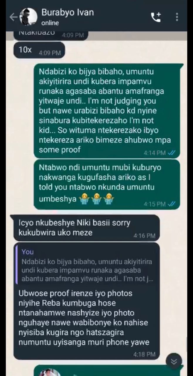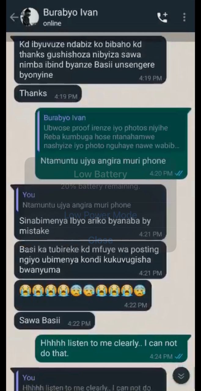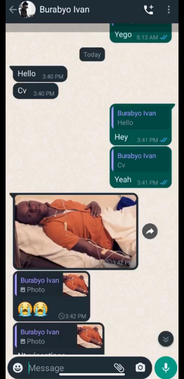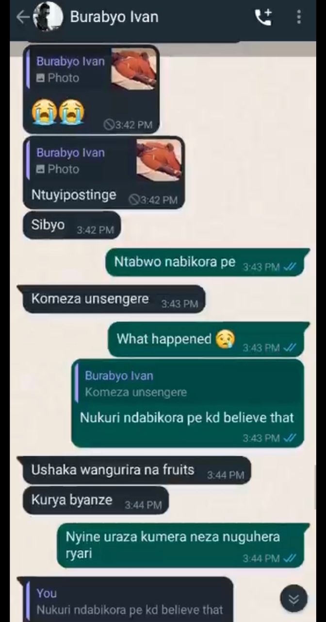 Nakomeje kugira ikibazo bigera n’aho musaba akampa ubutumwa uwo muntu yoherereje inshuti ze, maze anyoherereza amashusho abivuga arimo n’ifoto ya Yvan Buravan aryamye (Ifoto itaragaragara ahantu na hamwe)