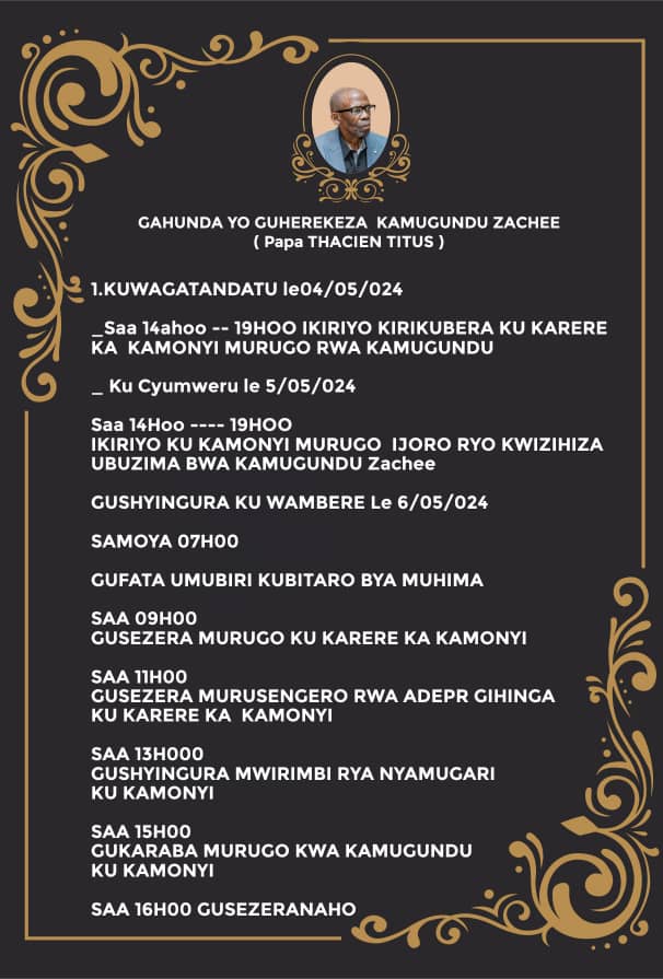 Ikiriyo kiri kubera ku Karere ka Kamonyi mu rugo rwa Kamugundu. Kuri iki Cyumweru haraba ijoro ryo kwizihiza ubuzima bwa Kamugundu Zachee. Ni mu gihe kuwa Mbere tariki 06 Gicurasi 2024 ari bwo nyakwigendera azashyingurwa mu irimbi rya Nyamugari ku Kamonyi.