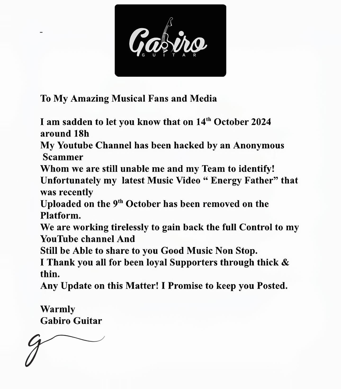 Mu ijoro ryo kuri uyu wa Mbere tariki 14 Ukwakira 2024, uyu muhanzi yasohoye itangazo rivugamo ko yibwe Shene ya Youtube n’umuntu atigeze amenya. Kandi ko indirimbo ye ‘Energy Father’ yari aherutse gushyira ku isoko yasibwe mu buryo bwamutunguye.