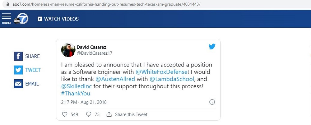 Icyo gihe, yahise agaragaza ibyishimo anyuze kuri Twitter, avuga ko yabonye akazi maze ashimira ababigizemo uruhare. ibi nyamakuru byinshi icyo gihe, byagarutse kuri iyi nkuru, birimo na abc7.com.